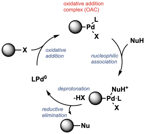 Many Pd-catalyzed cross coupling reactions involve oxidative addition to form Pd(II) derivatives called oxidative addition complexes (OAC). The resulting L–PdII(Ar)X OAC is electrophilic such that it reacts with a nucleophile and forms C–C and C–heteroatom bonds, after reductive elimination.[61] Such PdIIOACs have been used as precatalysts.[62] OACs exhibit stability, which allows reactions to proceed under mild conditions. They have been applied to bioconjugation.[63] For example, RuPhos and SPhos have been used as ligands for Pd-mediated cysteine arylation, and the use of BrettPhos and t-BuBrettPhos are critical for lysine arylation.[64][65][66][67]