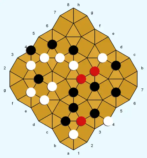 The Diamond gameboard consists of interlocking squares and triangles. White and Black each control 12 game pieces of their own color. Neutral pieces (red-colored in the diagrams) enter the game via captures. The pieces are played on the line intersections (called points, as in Go). White and black (but not red) pieces can move along straight lines to adjacent unoccupied points. A player wins by being the first to occupy all four corners (points) of a board square with their pieces.[1]