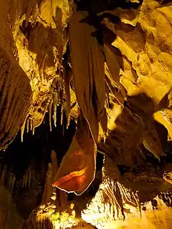 The cave is mostly limestone, which was laid in the late Mississippian Period when most of Kentucky was under a shallow warm sea.[2] There are also large deposits of calcite. Fresh water dissolves the limestone, and then deposits the mineral as the water itself loses its acidic nature.[3] Other speleothems (formations) which can be viewed at Diamond Caverns include: Soda Straws, Stalactite, Columns, Flowstone, Drapery/Bacon Strip, and Cave Pearl.[4]