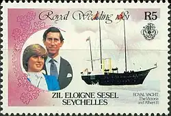 Diana became Princess of Wales at age 20 when she married Charles, then 32, on 29 July 1981. The wedding was held at St Paul's Cathedral, which offered more seating than Westminster Abbey, a church that was generally used for royal weddings.[21][26] The service was widely described as a "fairytale wedding" and was watched by a global television audience of 750 million people while 600,000 spectators lined the streets to catch a glimpse of the couple en route to the ceremony.[21][47] At the altar, Diana inadvertently reversed the order of his first two names, saying "Philip Charles" Arthur George instead.[47] She did not say she would "obey" him; that traditional vow was left out at the couple's request, which caused some comment at the time.[48] Diana wore a dress valued at £9,000 (equivalent to £43,573 in 2023) with a 25-foot (7.62-metre) train.[49] Within a few years of the wedding, the Queen extended Diana visible tokens of membership in the royal family, lending her the Queen Mary's Lover's Knot Tiara[50][51] and granting her the badge of the Royal Family Order of Elizabeth II.[52][53]