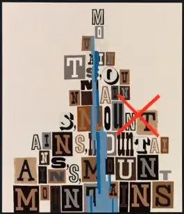 In her show "Devoured by Symbols" (Tony Wight, 2008), Guerrero-Maciá recontextualized incongruous, familiar or banal mediated text and, increasingly, imagery in stitched, multi-textile works that playfully reworked painting conventions invoking the sublime: landscape, portrait, narrative, abstraction (e.g., The Tempest, Like a Rainbow).[8][23][27] In the large-scale work, The Bigger Picture, she operated like a concrete poet, creating a visual mountain out of the letters that comprise the word "mountains."[23] New City described the show as a "convergence of typography … feel-good imagery, fuzzy materiality and tragically romantic quotations" that evoked contemporary political anxiety and a sense of "good wishes unfulfilled."[8]
