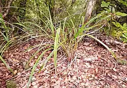 Seed germination is the beginning of the life cycle of Dianella nigra, which occurs in autumn (March–May).[10] Native birds such as kererū and tūī eat its blueberries and scatter seeds throughout the forest.[7] As the seeds pass through bird digestive systems, this helps to scarify the seeds. They remain dormant in the soil for several months before sprouting.[9] Young plants take their time growing, first building underground rhizomes and slender, lance-shaped leaves.[11] It takes approximately 3–5 years for individuals to reach reproductive maturity, at which point they produce tall flowering stems.[10] Flowering occurs from late spring to mid-summer (November–December), with insects such as bees doing the pollinating.[7] Following pollination, berries develop by late summer (February–April), turning iridescent blue to purple black, which attracts birds for seed more dispersal the plant to colonize new areas.[7] While aerial parts may die back under stress, the rhizome underground remains viable, which allows the plant to regenerate. The species is long-lived, it can live for several decades, with growth typically slowing during winter (June–August).[12]