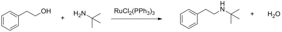 Dichlorotris(triphenylphosphine)ruthenium(II) serves as a precatalyst for the hydrogenation of alkenes, nitro compounds, ketones, carboxylic acids, and imines. On the other hand, it catalyzes the oxidation of alkanes to tertiary alcohols, amides to t-butyldioxyamides, and tertiary amines to α-(t-butyldioxyamides) using tert-butyl hydroperoxide. Using other peroxides, oxygen, and acetone, the catalyst can oxidize alcohols to aldehydes or ketones. Using dichlorotris(triphenylphosphine)ruthenium(II) the N-alkylation of amines with alcohols is also possible (see "borrowing hydrogen").[8]