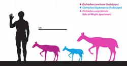 The Xiphodontidae is characterized by its species being very small to medium in size. Speciose xiphodonts such as Dichodon and Haplomeryx tended to have displayed evolutionary increases in size. Unlike Xiphodon with a consistent medium size range and Haplomeryx with a very small to small size range, Dichodon included small to medium sized species.[17] The larger-sized species compose of D. cervinum, D. cuspidatum, D. stehlini, and D. biroi while the others, namely D. frohnstettensis, D. simplex, D. subtilis, D. cartieri, D. lugdunensis, and D. ruetimeyeri, are smaller-sized.[31][16] The M2 of the smaller-sized D. lugdunensis, for instance, measures 7 mm (0.28 in) long and 7.7 mm (0.30 in) wide.[17] In comparison, the dentition of D. stehlini is very large based on M2 measuring 13 mm (0.51 in) long and 14 mm (0.55 in) wide, attesting to the gigantism of it and D. cuspidatum compared to other species. The two very large species were probably offshoots appearing at later points of time that did not last long,[13][31] as evident by their restricted single localities.[17][35]