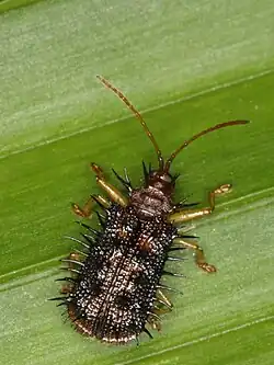 Finally the adult beetle, known as an imago, emerges and cuts its way out of the larval tunnel and surrounding leaf. The imago is ~5mm long, and bluish black with a spiny body. The average longevity of the adult is 24 days for the female, and 16 days for the male, although some individuals have been known to live as long as 90 days.[3][4] Adults have long, well-developed spines on the prothorax and elytra. Four spines project from the metanotum, and the elytra contains a row of ten spines along lateral margins, and nine dorsolateral spines.[5]