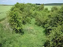 Intermediate stations were to have been provided on the route and a story grew up that the St James' Park, Southampton site in Shirley was excavated for this purpose, often repeated in local books.[8][2] Deposited plans, however, show the park site already existed within the surrounding road layout and was not part of the planned route, which ran to the north east of St James' Church; its current sunken appearance was caused by later gravel extraction.[11] Archival research by the Shirley Local History Group, notably among the records of a local landowner revealed that a later revival of this scheme, the Southampton and Winchester Great Western Junction Railway, intended to use the park as the original route at this location had by then been developed. Plans and sections dated 1901 show the intended route of the railway as passing through the park from East to West.[12] Records indicated that property sales were discussed for this scheme, which would have followed a slightly different route to the previous scheme in some areas without a tunnel at Chilworth. South of St James's Park at this time Didcot, Newbury and Station (now Stratton) Roads were named. Station Road also contained a police station.[13][14] The only physical remnant of the project in Southampton is the tree covered embankment hidden behind current properties east of Hill Lane between Milton Road and Commercial Road. The deposited plans for the route through Southampton[11] and current land levels suggest this was also the location of the viaduct work described by Sands.[15] A photograph described as illustrating the part built viaduct from the London and South Western Railway appears in both the book An Illustrated History of the Didcot, Newbury and Southampton Railway[16] and in a detailed article about the Didcot Newbury and Southampton Railway in Southampton in the Hampshire Industrial Archaeology Society Journal, No. 26 (2018).[9]