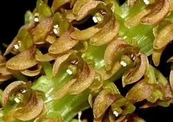 Dienia, commonly called snout orchids,[2] is a genus of six species of orchids in the family Orchidaceae. Plants in this genus are evergreen, mostly terrestrial plants with a fleshy, above ground stem, large, pleated leaves and small, non-resupinate flowers with thin sepals and petals. The labellum is short and tongue-like. The genus is distributed in Southeast Asia, Australia, Micronesia and Melanesia.