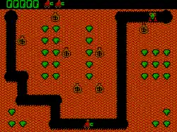 Features of Digger are similar to those in the arcade games Mr. Do! and Dig Dug. The player is placed in an underground maze and can dig horizontal and vertical tunnels through it. At least one tunnel already exists at the start of play. At various points on the board are emeralds (usually in clusters) and bags of gold. Monsters (initially in the "nobbin" form) appear at the top-right corner. If earth is excavated from under a gold bag, then the bag will wobble for a few seconds and then drop; if it falls more than one row, it will break open after falling, releasing gold, which can be collected. Bags can be pushed left or right into vertical paths, with similar results. Falling bags will squash monsters, but they will also squash the digger. The digger has a weapon, which fires in a straight line, but takes several seconds to recharge (taking longer as the levels go higher).