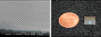 The devices are fabricated on standard wafers; one of typical devices is presented below (from the NOD web site). While the total number of nano-grooves is huge (≥106), a typical device size of DPH devices is on the millimeter scale. The small footprint of the DPH makes it possible to combine with other elements of photonic integrated circuits, such as coarse demultiplexers[3] and interferometers.[4]