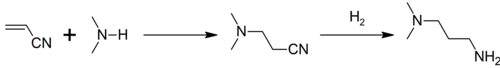 DMAPA is commonly produced commercially via the reaction between dimethylamine and acrylonitrile (a Michael reaction) to produce dimethylaminopropionitrile. A subsequent hydrogenation step yields DMAPA:[2]