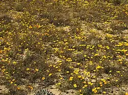 Dimorphotheca sinuata grows in western South Africa and in Namibia, very often in places receiving winter rainfall but also in sandy deserts.[8] It flowers early in spring. It is an annual sometimes exceeding 30 cm (12 inches) in height. Flower heads are generally yellow or orange with purple markings, containing both ray florets and disc florets.[9][10]
