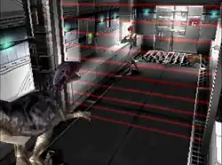 Dino Crisis features survival horror gameplay that is very similar to Capcom's early Resident Evil titles.[6] Regina can walk, run, turn, backpedal, push and climb objects, and perform a 180-degree turn.[7] A map is available which will show Regina's location, destination, save points, and locked doors.[7] Save points are rooms which will prompt the player to save upon exiting them.[7] Some doors are locked by a D.D.K. (digital disk key) device. To open these doors, the player will need both a code disc and input disc which can then be used to decipher a code and unlock the door.[7] There are also force fields of red beams throughout the complex which can be activated to block access to intruders.[7]