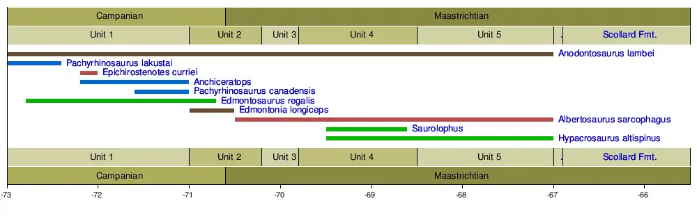 The upper portion of the formation is more diverse and preserves better quality fossils.[6] However, many of the taxa that supposedly distinguished it as a separate fauna have since been found in older sediments. In particular, Gryposaurus latidens and Hypacrosaurus have been found to coexist with Maiasaura.[5] Further, there are fossil teeth that seem to show the presence of certain taxa are unbroken throughout the whole formation.[5]