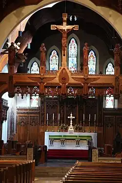 Much of the interior of the cathedral is a credit to the effort of the second bishop, Charles Chapman Grafton. There are outstanding examples of late Victorian ecclesiastical art including woodcarvings from the workshop of Balthasar Schmitt, a German artisan who emigrated to the US for the job, the Fond du Lac Church Furnishings Company, and the Svoboda Church Furniture Company of Kewaunee, Wisconsin. The frontal on the St. Augustine chapel altar is an exquisite piece of color-infused marble. The stained glass is by Robert L. Jacoby and the Canadian John Spence Company.