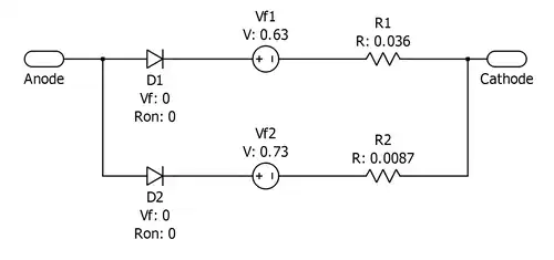 When more accuracy is desired in modelling the diode's turn-on characteristic, the model can be enhanced by doubling-up the standard PWL-model. This model uses two piecewise-linear diodes in parallel, as a way to model a single diode more accurately.