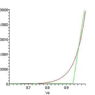The figure shows a real diode I-V curve being approximated by a two-segment piecewise linear model. Typically the sloped line segment would be chosen tangent to the diode curve at the Q-point. Then the slope of this line is given by the reciprocal of the small-signal resistance of the diode at the Q-point.