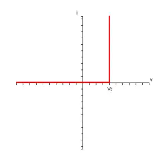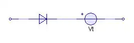 If the anode of the diode is connected to 0 V, the voltage at the cathode will be at Vt and so the potential at the cathode will be greater than the potential at the anode and the diode will be reverse biased. In order to get the diode to conduct, the voltage at the anode will need to be taken to Vt. This circuit approximates the cut-in voltage present in real diodes. The combined I-V characteristic of this circuit is shown below: