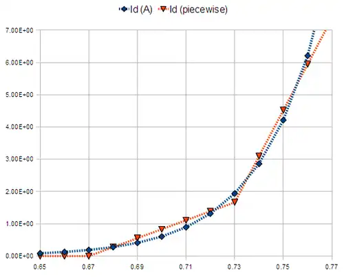 I-V characteristic of the standard PWL model (marked by red-triangles), as described above. Shown for reference is the standard Shockley-diode model (marked by blue-diamonds). The Shockley parameters are Is = 1e - 12 A, Vt = 0.0258 V
