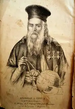 Dionysios Pyrrhos was a monk from Thessaly. He studied in Tyrnavos and Kydonies under Ioannis Pezaros and Benjamin of Lesbos. He then studied medicine in Italy, and when he returned he taught philosophy and sciences in Athens. After the Greek War of Independence he returned to Athens again devoting himself to writing and practicing medicine. Apart from writing he also created maps and earth and celestial sphere globes. He also attempted to create a paper mill, but he failed. He set up a lithography place in Athens. He estimated the amount of the books he had printed to be about 25,000 volumes, covering a range of subjects: medicine, geography, history, morality, grammar.[3] He died on 13 February 1853.[4]