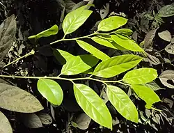 Evergreen trees up to 16 m tall, with smooth, black bark. The blaze is a dull orange. The young branchlets are cylindrical, covered by black, sooty hairs. The tree's leaves are simple, alternate, distichous, with petioles about 0.5-1.1 cm long, flat, glabrous. The leaf blade is about 9 to 27 cm long by 3.5–8 cm wide, and has an entire margin and a raised midrib. The leaf shape is usually narrow elliptic-oblong to lanceolate, with acute to acuminate apex ending in a blunt tip. The leaf base is acute to rounded. The leaf is thick (coriaceous) with minute pellucid dots beneath. The venation, with 6-9 pairs of secondary nerves, is strongly and closely reticulate on both surfaces.[5]