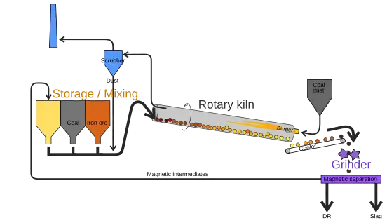 • processes where the reducing gas is obtained from coal. The reactor is generally an inclined rotary kiln, similar to those used in cement plants, in which coal is mixed with limestone and ore, then heated.