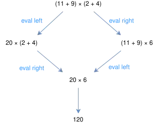 The usual rules of elementary arithmetic form an abstract rewriting system. For example, the expression (11 + 9) × (2 + 4) can be evaluated starting either at the left or at the right parentheses; however, in both cases the same result is eventually obtained. If every arithmetic expression evaluates to the same result regardless of reduction strategy, the arithmetic rewriting system is said to be ground-confluent. Arithmetic rewriting systems may be confluent or only ground-confluent depending on details of the rewriting system.[1]