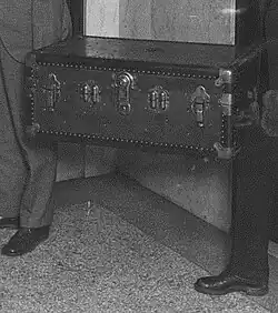 On October 29, after the defense rested its case, District Attorney Asa Keyes announced the September discovery of a large blue steamer trunk allegedly owned by Ormiston and thought to be full of McPherson's clothing. On November 8, 1926, a Kansas City private detective, described as a "go between" for Ormiston, transmitting him money and messages, stated the trunk was a "fake".[117] Ormiston, who was still eluding authorities to avoid being pressured to reveal Miss X's true name, said on November 19 "the trunk is bunk."[118] Some of the clothing was found to be the wrong size for McPherson.[119] The trunk became an object of jokes, in reference to anything unwanted, unknown, or lost as being laid away in that big blue trunk.