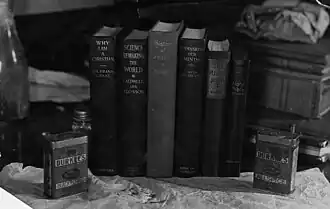 The Carmel cottage was further checked for fingerprints, but none belonging to McPherson were recovered. Two grocery slips found in the yard of the cottage were studied by a police handwriting expert and determined to be McPherson's penmanship. While the original slips later mysteriously disappeared from the courtroom, photostat copies were available.[83] The defense had a handwriting expert of their own and claimed to have a photograph of the well publicized slips which differed from the police photostat. They contended the reproduction "had been maliciously tampered with" to resemble McPherson's handwriting.[84] The slips' suspicious origin was also questioned. The original slips would have been in the yard for two months, surviving dew, fog, and lawn maintenance before their discovery by deputy DA Ryan.[85] Frustrated with his own witnesses and evidence, at the close of one of the day's sessions, prosecutor Keyes disgustedly threw a stool top after the departing courtroom crowd.[86]