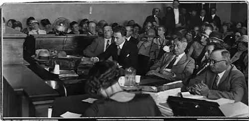 In December, Ormiston was found by newsmen, living quietly in Harrisburg, Pennsylvania. Papers described him being taken without resistance by police while sitting at a typewriter.[120] A Harrisburg detective characterized the affair as a "publicity stunt," but declined to elaborate. Among Ormiston's personal effects were five diplomas from five radio schools and letters implying he had a wife in Brazil.[100] He was escorted to Chicago, Illinois with intent to be transported to Los Angeles. Asa Keyes said he would “do everything in his power” to extradite Ormiston. However, he did not stop in Chicago to pick him up though he traveled near there on his way to and from Washington, D.C. The Chicago police chief denounced Keyes for "yelling to high heaven for his apprehension" but when the fugitive Ormiston was "within reach," Keyes called Ormiston of minimal importance.[102][121] The Chicago police chief lacked proper documents for further action, and to the annoyance of Los Angeles officials, Ormiston was released. When the warrant was finally obtained, Chicago police were ready to transport their expected prisoner, Ormiston, to Los Angeles [122] In the meantime, Ormiston appeared in Los Angeles surrounded by newsmen and was greeted by the entire prosecution staff. Affably, amidst the flashbulbs of photographers, Ormiston accepted his served warrant. His bond was set at $2,500.[123]