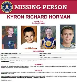Kyron Richard Horman (born September 9, 2002) is an American boy who disappeared from Skyline Elementary School in Portland, Oregon, on June 4, 2010, after attending a science fair.[1] Local and state police, along with the Federal Bureau of Investigation (FBI), conducted an exhaustive search and launched a criminal investigation, but have not uncovered any significant information regarding the child's whereabouts.[2] Horman's disappearance sparked the largest criminal investigation in Oregon history. As of 2025, his whereabouts remain unknown.