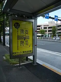 A bus stop in Shinonome, Tokyo, with a poster for Disaster Prevention Day in September 2015.
