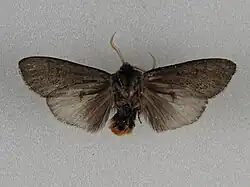 As suggested by its colloquial name, this moth is defined by the tuft of yellow hairs extending from its tail region. Discoophlebia Catocalina is a medium-sized moth roughly 40-60mm in wingspan. Its forewings and backwings are grey and the backwings have a broad white border.[1]
