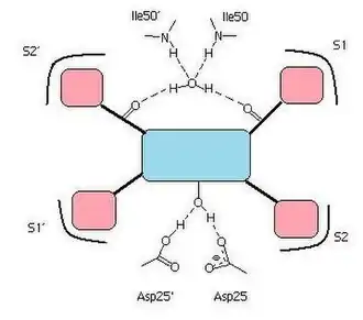 The HIV protease is a C2-symmetric homodimeric enzyme consisting of two 99 amino acid monomers. Each monomer contributes an aspartic acid residue that is essential for catalysis,[6] Asp-25 and Asp-25´. The HIV protease has the sequence Asp-Thr-Gly, which is conserved among other mammalian aspartic protease enzymes. An extended beta-sheet region on the monomers, known as the flap, constitutes in part the substrate binding site with the two aspartyl residues lying on the bottom of a hydrophobic cavity.[12][16][17] Each flexible flap contains three characteristic regions: side chains that extend outward (Met46, Phe53), hydrophobic chains extending inward (Ile47, Ile54), and a glycine rich region (Gly48, 49, 51, 52). Ile50 remains at the tip of the turn and when the enzyme is unliganded a water molecule makes hydrogen bonds to the backbone of Ile50 on each monomer.[17]