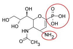 N-acetylneuraminic acid (Neu5Ac) is one of the two most common sialic acid in mammals.[9] It is a monosaccharide with a backbone of 9 carbons. It is usually attached to glycoproteins or gangliosides on a terminal end via α(2,3), α(2,6), and α(2,8) linkage.[10] Neuraminidase is an enzyme which hydrolyses that bond to produce a free neuraminic acid and a glycoprotein or a sugar chain. Influenza virus will bind via the hemagglutinin protein on these sialic acid attached glycoproteins on the cell membrane.[11]