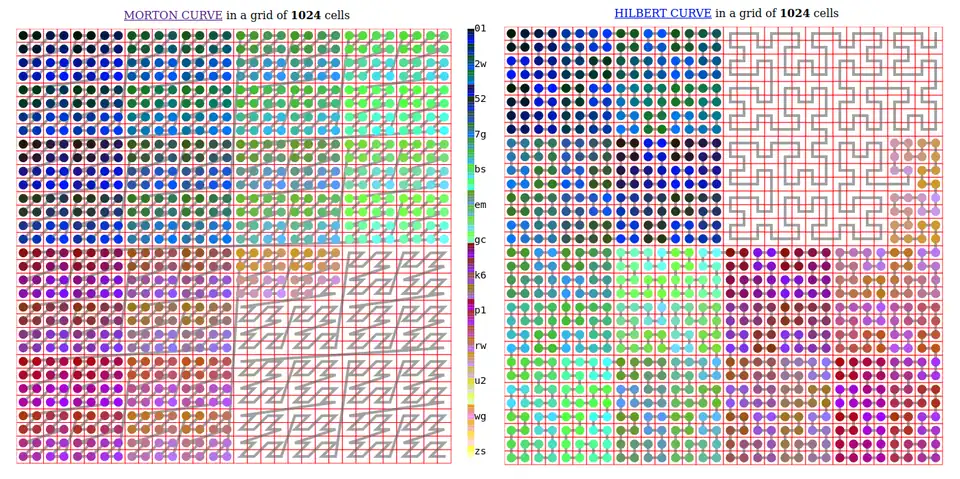 | Geohash: Latitude and longitude are merged, enterlacing bits in the joined number. The binary result is represented with base32, offering a compact human-readable code. When used as spatial index, corresponds to a Z-order curve. There are some variants like Geohash-36. | ![]() | |||