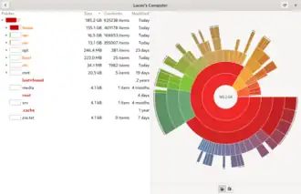 Disk Usage Analyzer is a graphical disk usage analyzer for GNOME. It is part of GNOME Core Applications. It was originally named Baobab after the Adansonia tree. The software gives the user a menu-driven, graphical representation of what is on a disk drive.[2] The interface allows for selection of specific parts of filesystem being scanned so a single folder, the entire filesystem, and even remote folders and filesystems can be scanned.[3] The graphical representation can be switched between a ring chart and a treemap chart so the presentation can be tailored to the specific content being scanned.[4]