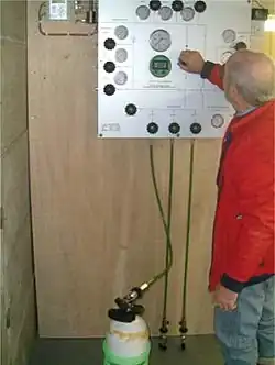 Cylinders may be filled directly from the compressor outlet, or from a filling manifold, via a flexible high-pressure hose with a filling valve and purge valve known as a filling whip. A pressure gauge is provided to monitor the pressure in the cylinder as it is filled. an overpressure valve or an electrical pressure-switch may be used to limit filling pressure if the compressor is set to a higher pressure than the developed working pressure of the cylinders to be filled.[2]