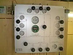 Compressors may be linked to a gas blending panel to make nitrox, trimix, heliair or heliox mixes.[11] The panel controls the decanting of oxygen and helium from cylinders bought from commercial gas suppliers.
