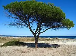 The forests of the park are diverse, ranging from conifer to deciduous trees and woodlands.[4] A large part of the forest resource is primarily located in the northern corner of Karavasta between the sandy beaches and the estuary of Shkumbin. Pine trees remain an increasingly dominant feature of the park represented by species such as aleppo and stone pine.[18][19][20] There are also different species of trees found in the park amongst them junipers, willows, oak, alder, elm and ash.[18]