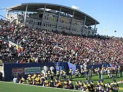 The first major changes to Dix Stadium began in 1992 when an elevator was added to reach the press box and suites, and in 1996 when permanent lighting was added.[10][11] Night games had been played since 1990, but with temporary lighting.[12] A new scoreboard and artificial turf were installed in 1997, which allowed the field hockey team to begin play at the stadium. The field hockey team played home games at Dix Stadium through the 2004 season before moving to the adjacent Murphy-Mellis Field in 2005. After the east side bleachers were condemned and demolished in 2001, the area remained open for the entire 2002 season. Prior to the start of the 2003 season, a new section of bleacher seating was built as the student section, bringing the total seating capacity to 29,287.[13]