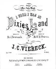 New Orleans publisher P. P. Werlein took advantage and published "Dixie" in New Orleans. He credited music to J. C. Viereck and Newcomb for lyrics. When the minstrel denied authorship, Werlein changed the credit to W. H. Peters. Werlein's version, subtitled "Sung by Mrs. John Wood," was the first "Dixie" to do away with the faux black dialect and misspellings. The publication did not go unnoticed, and Firth Pond & Co. threatened to sue. The date on Werlein's sheet music precedes that of Firth, Pond & Co.'s version, but Emmett later recalled that Werlein had sent him a letter offering to buy the rights for $5.[60] In a New York musical publishers' convention, Firth, Pond & Co. succeeded in convincing those present that Emmett was the composer. In future editions of Werlein's arrangement, Viereck is merely credited as "arranger." Whether ironically or sincerely, Emmett dedicated a sequel called "I'm Going Home to Dixie" to Werlein in 1861.[61]