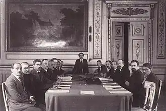 Korkmasov was particularly involved in Turkic affairs under Soviet rule. He was one of the negotiators of the 1921 Treaty of Moscow between the Russian SFSR and the Turkish Government of the Grand National Assembly, signing the treaty on the Russian government's behalf. He was co-chairman of the first First All-Union Turkological Congress, and deputy of the council tasked with drafting the Yañalif script for the romanisation of Turkic languages.[40] In 1925, amidst the repression of the 1924–1925 Chechen uprising, Korkmasov was one of Dagestan's leaders, alongside Najmuddin Samurskii, who refused to allow a large-scale Red Army presence on their territory to detain suspected insurgents. Military operations in Dagestan eventually occurred in 1926, leading to the disarmament of the local population.[41] In December 1931, Korkmasov was appointed to the Central Executive Committee of the Soviet Union as deputy secretary of the Soviet of Nationalities. His portfolio as deputy secretary included oversight of publishing, scientific and post-secondary educational institutions and religious affairs. Prior to his appointment, he was a member of the Central Executive Committee since its establishment in 1922, as well as a member of the All-Russian Central Executive Committee since 1920.[1]