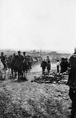 The First Battle of Port-Petrovsk began on 23 March 1918 as Najmuddin's forces entered the city at the Regional Executive Committee's urging in an effort to crush the soviet. Ṭahaq̇adiqala noted that the battle, which killed 1,200 people, was an effective declaration of war against the Russian Soviet Federative Socialist Republic, which surrounded the North Caucasus from the south (Baku), north (Astrakhan), and west[21] (Vladikavkaz, which had been taken over by the Bolsheviks in January).[22] In the aftermath of the battle, the Mountainous Republic quickly descended into anarchy, as militias loyal to Uzun-Hajji looted and destroyed the city of Khasavyurt.[21]