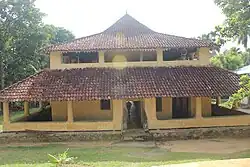 There are three Buddha statues in the image house at the upper floor which is surrounded by a veranda. All the statues are curved out of timber.[6] The inner walls and the ceiling of the image house are decorated with Kandyan period murals. Among them a portrait of the Kirti Sri Rajasinha (1747–1782) wearing the Kurulu Padakkama (Bird pendant) has been identified.[7] Kurulu Padakkama is a jewel made for the Adikaram Molligoda which has a Sinhalese inscription on the reverse.[8] Also an old wide-mouthed large earthen vessel called Pathra, used to hold water or to receive offerings from worshipers, has been preserved in the Vihara premises today.[9]