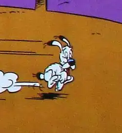 A dog similar to Dogmatix appeared in page 28 of Asterix & the Golden Sickle.[4] Dogmatix first appears in Asterix and the Banquet.[2] Sitting outside a butcher's shop in Lutetia, he observes Asterix and Obelix go in. He then follows them all around Gaul, appearing in nearly every panel of the remainder of the story. The two men do not notice him until the very end, when he finally attracts Obelix's attention at the closing banquet and is given a pat on the head and a bone. Goscinny's original script simply specified that a little dog sat next to the butcher's shop: it was Uderzo who came up with the idea of including the dog for the rest of the story.[5]