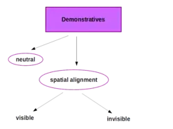 Dom has a spatial referencing demonstrative system, i.e. there are certain demonstrative lexemes bearing information about the spatial relation of the referred object to the speaker alongside neutral demonstratives. A Dom speaker also uses different lexemes for visible and invisible objects. In the case of visible objects, the speaker locates it on a horizontal and vertical axis as to whether it is proximal, medium or distal from the speaker and on the same level, uphill or downhill.
