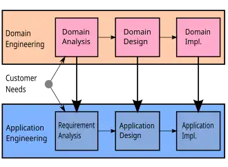 Domain engineering focuses on capturing knowledge gathered during the software engineering process. By developing reusable artifacts, components can be reused in new software systems at low cost and high quality.[6] Because this applies to all phases of the software development cycle, domain engineering also focuses on the three primary phases: analysis, design, and implementation, paralleling application engineering.[7] This produces not only a set of software implementation components relevant to the domain, but also reusable and configurable requirements and designs.[8]