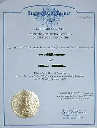 - ^ "Domestic Partners Registry - California Secretary of State". Ss.ca.gov. 2013-06-26. Archived from the original on 2008-07-19. Retrieved 2013-12-03.