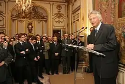 Contrary to what his surname suggests, Villepin is not from an aristocratic background. His ancestors added the particle "de" to the family name.[8] His great-grandfather was a colonel in the French army, his grandfather was a board member for several companies, and his father Xavier de Villepin was a diplomat and a member of the Senate. Villepin speaks French, English and Spanish.