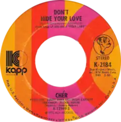 "Don't Hide Your Love" is a song released by American singer-actress Cher as the second single released from the album Foxy Lady. The song was written by Neil Sedaka and Howard Greenfield. It hit number 46 on the Billboard Hot 100, and number 19 on the Adult Contemporary chart.[3]